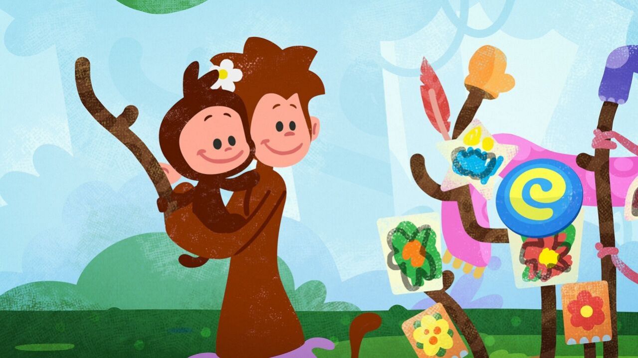 טופי וחברים הילדים רצים בין העצים וטופי פוגש קוף שמוחא כפיים.